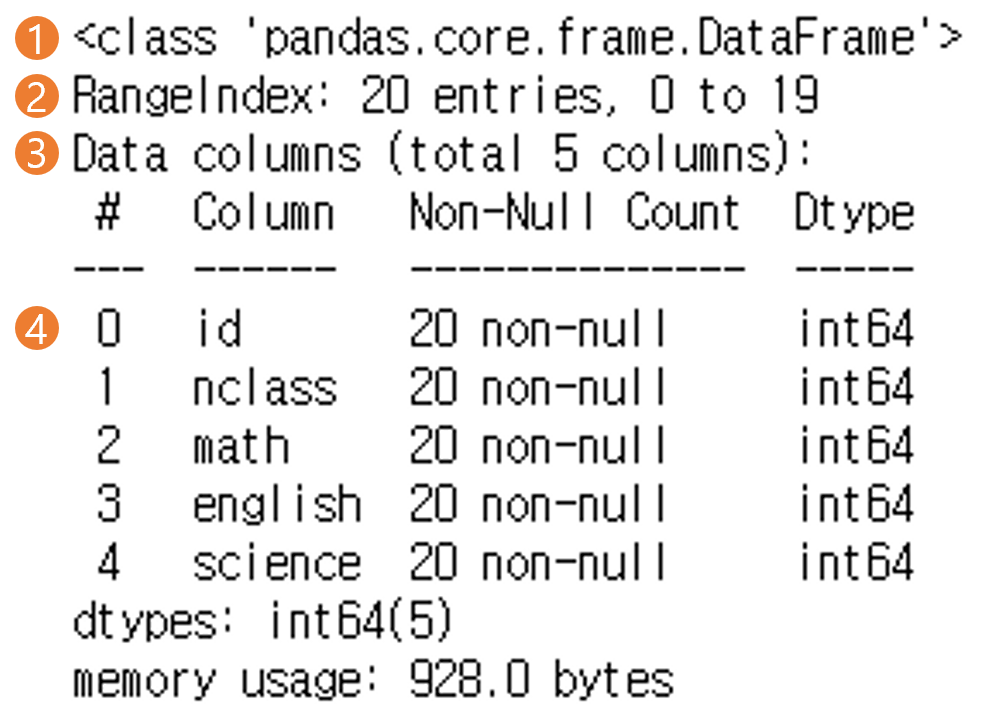 ➍ 여섯 번째 행부터 데이터 프레임에 들어 있는 변수들의 속성이 표시됨. 각 행에 변수 순서(#), 이름(Column), 변수에 들어 있는 값의 개수(Non-Null Count), 속성(Dtype)을 보여줌. 예를 들어 0번째 변수 id를 보면 20개의 값이 있고 정수(int64)로 된 변수라는 것을 알 수 있음. 변수의 속성은 정수(int64)외에도 실수(float64), 문자(object), 날짜 시간(datatime64) 등이 있음.