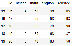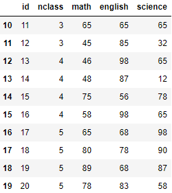 exam.tail(10) # 뒤에서부터 10행까지 출력