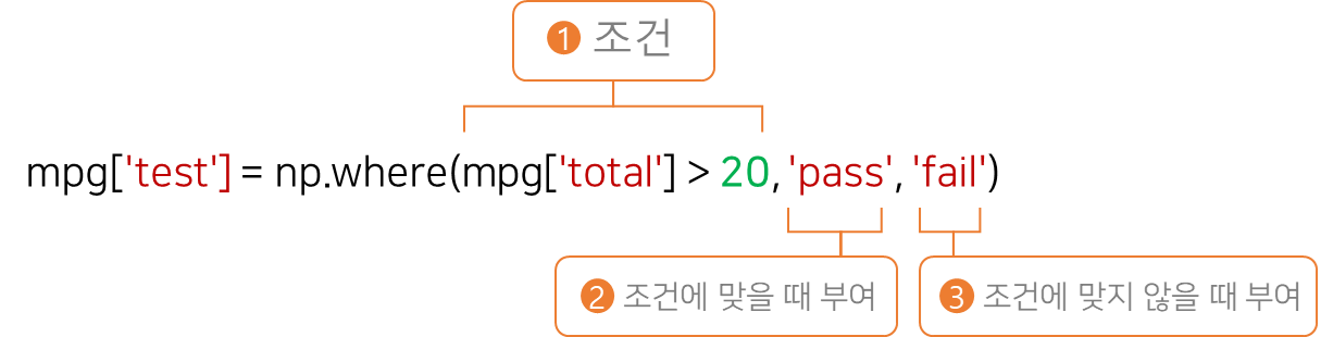 mpg['test'] = np.where(mpg['total'] >=20, 'pass', 'fail') # 조건문 활용