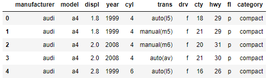 - 하나의 행이 자동차 한 종에 대한 정보를 의미하므로, mpg가 자동차 234종에 대한 11개 변수로 구성된다는 것을 알 수 있음.