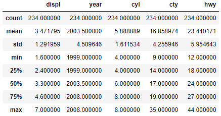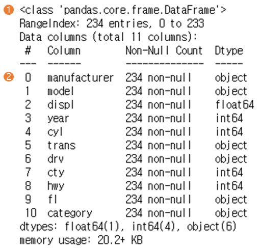 ➋ Column 아래 manufacturer를 보면, 234개의 값이 있고 문자(object)로 된 변수라는 것을 알 수 있음. 그 밑으로도 같은 방식으로 각 변수의 속성을 보여줌. Dtype에서 object는 문자, float64는 소수점이 있는 실수, int64는 소수점이 없는 정수를 의미함.