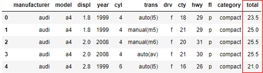 mpg['total'] = (mpg['cty'] + mpg['hwy']) / 2 # 변수 조합