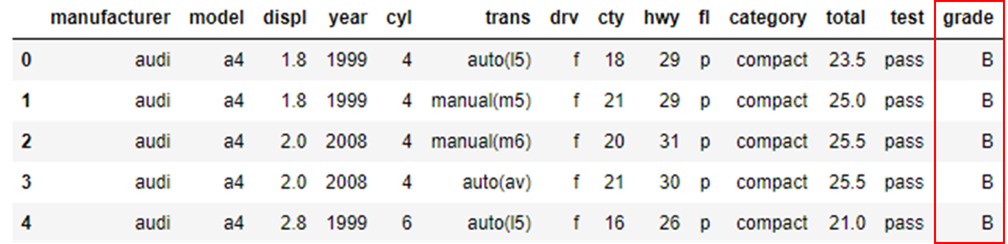 mpg['grade2'] = np.where(mpg['total'] >= 30, 'A',