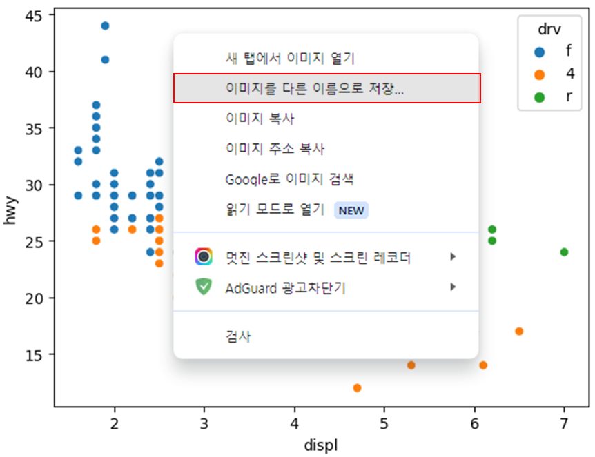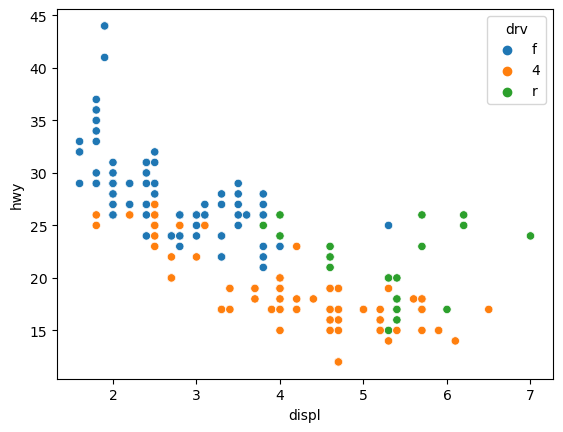 hue를 이용하면 표식(marker)의 색깔을 종류별로 바르게 표현할 수 있음. 다음 코드를 실행하면 drv(구동 방식)에 따라 표식의 색깔을 다르게 표현한 산점도를 출력함.