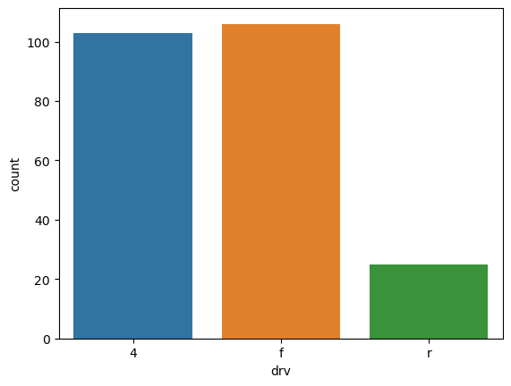 sns.barplot() 대신 sns.countplot()을 이용하면 df.groupby()와 df.agg()를 이용해 집단별 빈도표를 만드는 작업을 생략하고 원자료를 이용해 곧바로 빈도 막대 그래프를 만들 수 있음. 다음 코드를 실행하면 mpg 원자료로 drv별 빈도를 구하는 막대 그래프를 만들어 출력함.