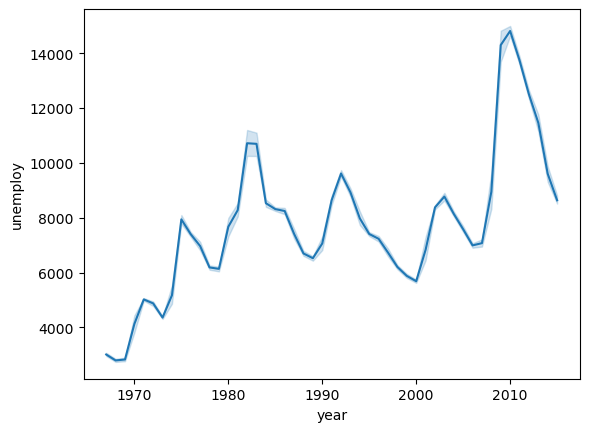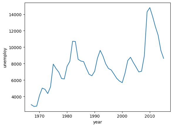 sns.lineplot(data = economics, x = 'year', y = 'unemploy')