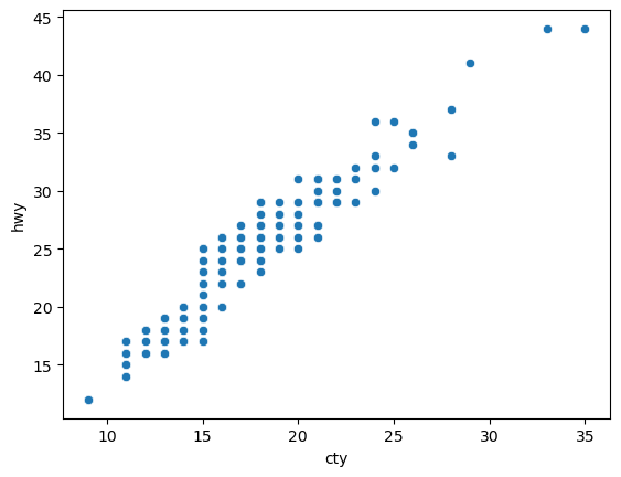 Q1. mpg 데이터의 cty(도시 연비)와 hwy(고속도로 연비) 간에 어떤 관계가 있는지 알아보려고 함. x축은 cty, y축은 hwy로 됨 산점도를 만들어 보자.