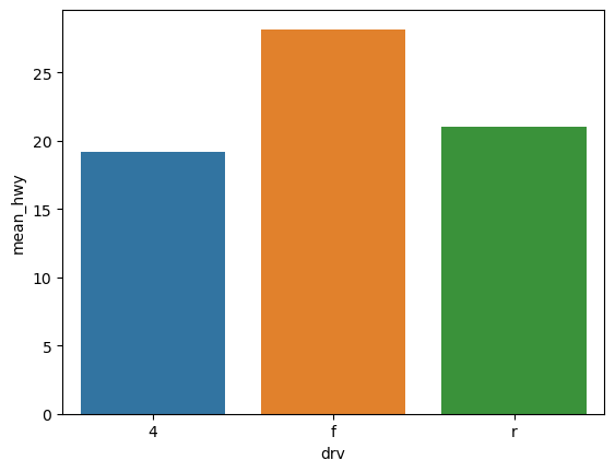 sns.barplot(data = df_mpg, x = 'drv', y = 'mean_hwy')
