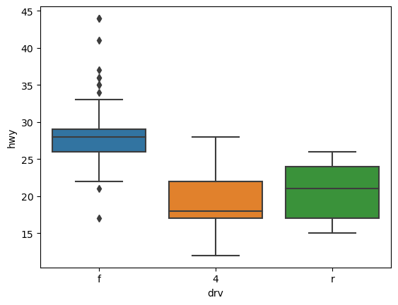 sns.boxplot()을 이용하면 상자 그림을 만들 수 있음. mpg 데이터를 이용해 x축을 drv, y축을 hwy로 지정하고 ‘구동 방식별 고속도로 연비’를 상자 그림으로 표현하겠음.
