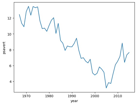 Q1. psavert(개인 저축률)가 시간에 따라 어떻게 변해 왔는지 알아보려고 함. 연도별 개인 저축률 변화를 나타낸 시계열 그래프를 만들어 보자.