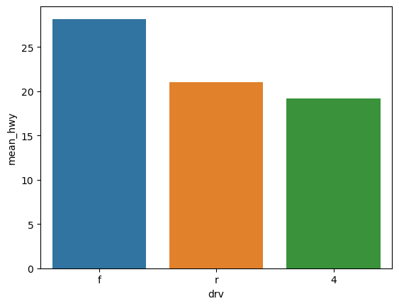 앞의 코드의 출력 결과를 보면 집단을 나타낸 변수 drv가 인덱스로 바뀌어 mean_hwy보다 아래에 표시되어 있음. seaborn으로 그래프를 만들려면 값이 변수에 담겨 있어야 함. 변수를 인덱스로 바꾸지 않고 원래대로 유지하려면 df.groupby()에 as_index = False를 입력하면 됨.