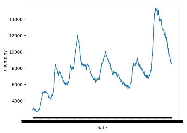 sns.lineplot()을 이용하면 선 그래프를 만들 수 있음. x축에는 시간을 나타내는 date, y축에는 실업자 수를 나타내는 unemploy를 지정해 선 그래프를 만들겠음.