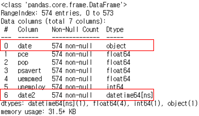 pd.to_datetime()을 이용하면 변수의 타입을 날짜 시간 타입으로 바꿀 수 있음. 다음 코드를 실행하면 economics에 날짜 시간 타입으로 된 변수 date2를 추가함.