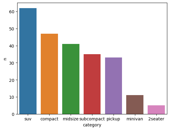 앞에서 만든 데이터 프레임을 sns.barplot()을 적용해 막대 그래프를 만들겠음. 다음 코드를 실행하면 drv별 빈도를 나타낸 막대 그래프를 출력함.