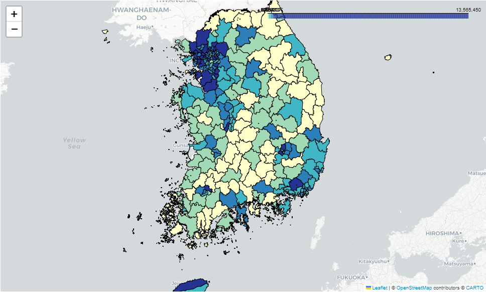 파라미터를 몇 가지 추가해 단계 구분도의 디자인을 보기 좋게 수정하겠음. 출력한 단계 구분도를 보면 인구가 많을수록 파란색, 적을수록 노란색에 가깝게 표현되어 시군구별 인구 차이를 한눈에 알 수 있음.