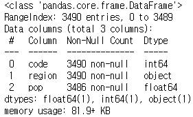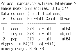 행정 구역 코드를 나타낸 df_pop의 code는 int64 타입으로 되어있음. 행정 구역 코드가 문자 타입으로 되어 있어야 지도를 만드는데 활용할 수 있음. df.astype()을 이용해 code를 문자 타입으로 바꾸겠음.