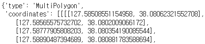 geo는 딕셔너리 자료 구조로 되어 있음. geo의 properties에 들어 있는 SIG_CD에 지역을 나타내는 행정 구역 코드가 담겨 있고, geometry에 시군구의 경계를 나타낸 위도, 경도 좌표가 담겨 있음.