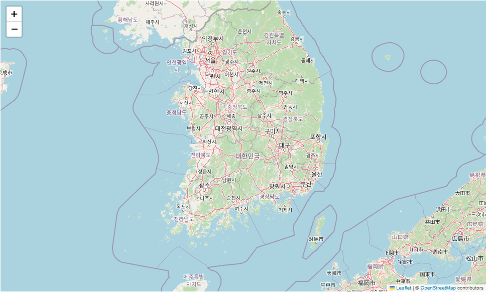 tip) 지도 크기는 모니터 크기와 해상도에 따라 달라짐. 다음과 같이 folium.Map(location = [35.95, 127.7], zoom_start = 8, width = '80%', height = '80%')