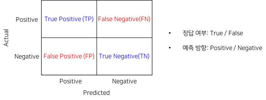 컨퓨전 매트릭스의 셀 이름은 True/False와 Positive/Negative의 첫 글자를 따서 TP, TN, FP, FN으로 줄여서 표현할 때가 많음. 줄임말을 알아두면 성능 지표 공식을 이해하기 편함.