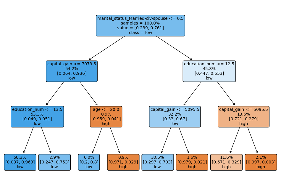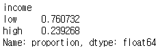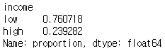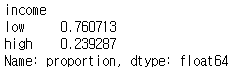 df['income'] = np.where(df['income'] == '>50K', 'high', 'low')