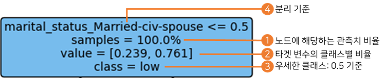 tip) 실제 계산에서는 노드 분리 전후를 비교하여 지니 계수(gini index)나 엔트로피(entropy)와 같은 불순도(imourity)를 가장 줄여주는 예측 변수를 선택함.