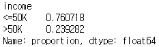 먼저 타겟 변수 income을 검토하여 전처리하겠음. income은 조사 응답자의 연소득 5만 달러를 초과하는지 여부를 나타냄. 다음 코드의 출력 결과를 보면 연소득이 5만 달러를 초과하는 사람(>50K)은 23.9%, 5만 달러 이하인 사람(<=50K)은 76%임.