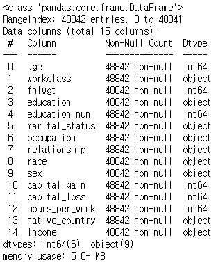 adult 데이터는 48,842명의 정보를 담고 있으며 변수 15개로 구성됨. 이 중 연소득을 나타낸 income을 타겟 변수, 나머지 14개 변수를 예측 변수로 사용하겠음.