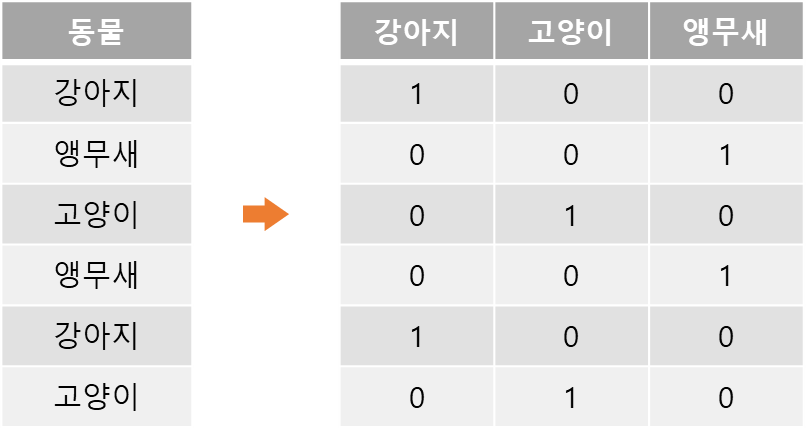 변수의 범주가 특정 값이면 1, 그렇지 않으면 0으로 바꾸면 문자 타입 변수를 숫자 타입으로 만들 수 있음. 이렇게 값을 1과 0으로 바꾸는 방법을 원핫 인코딩(one-hot encoding)이라 함.
